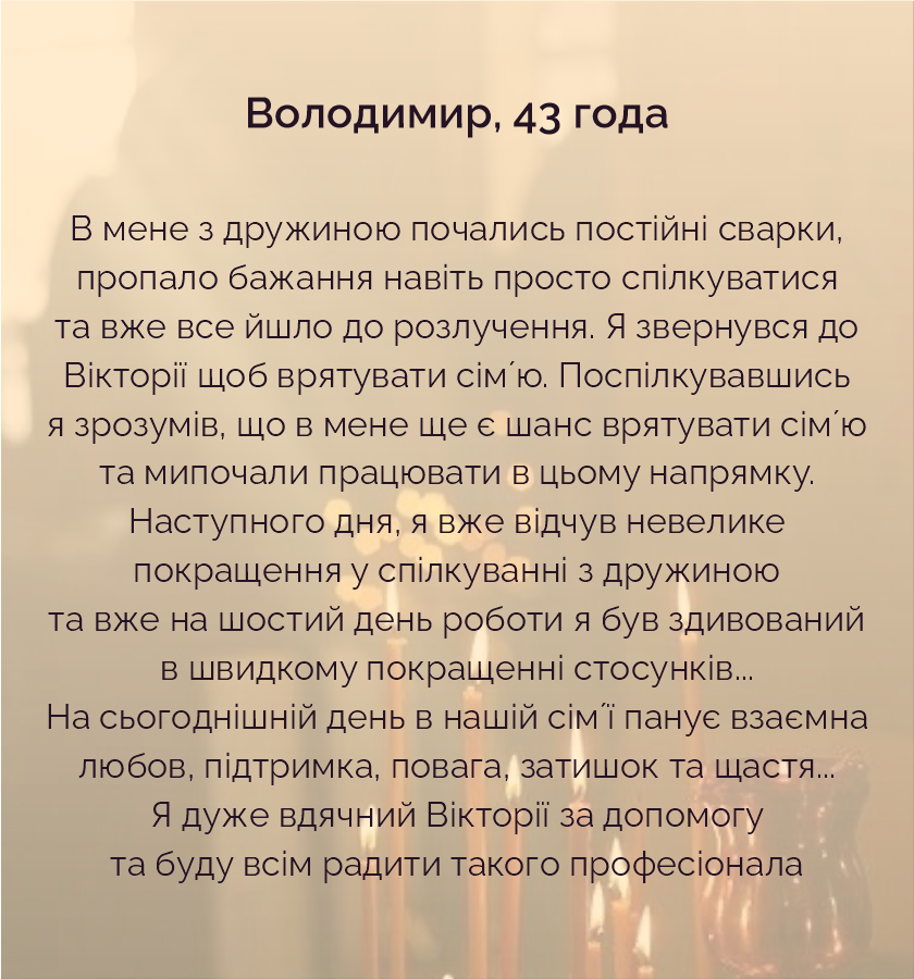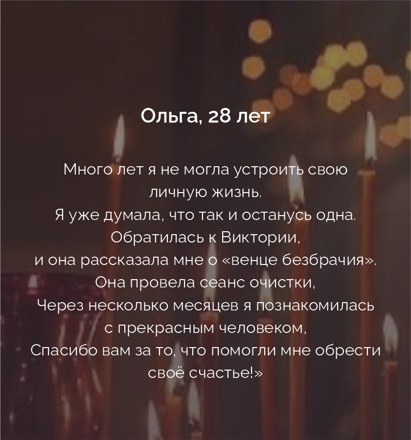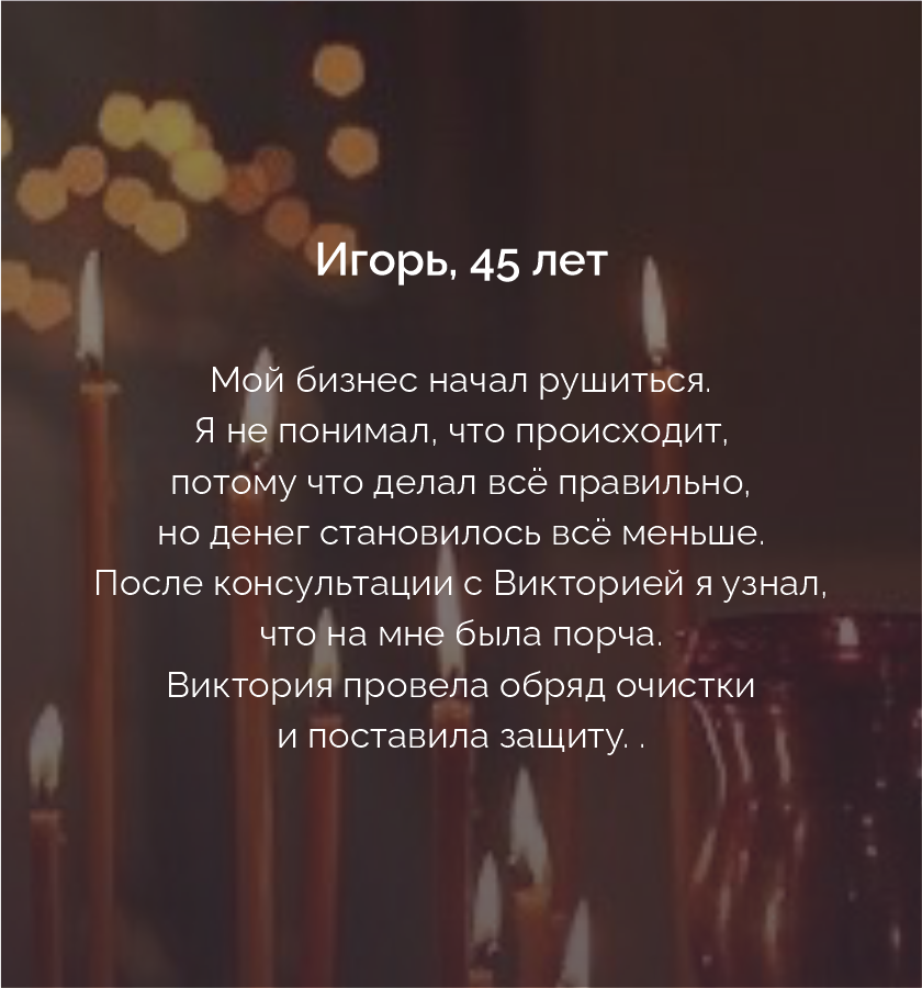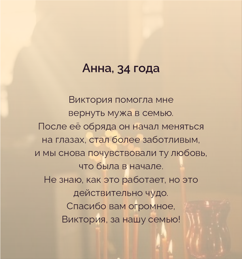 Не бойтесь обратиться ко мне, ведь помощь получают все, кто о ней попросит. Это воля светлых сил. Вы можете быть уверены в том, что ваша проблема будет решена.